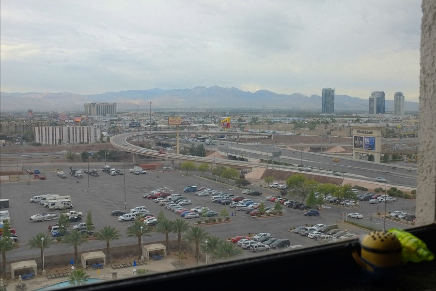 Der Tag begann mit Lars' Umzug vom Luxor ins Excalibur. Im Gegensatz zu mir wohnt er im Tower 2, der etwas neuer eingerichtet ist und wo die Zimmer noch nicht so verwohnt wie im Tower 1 sind, dafuer kosten die Uerbernachtungen ein paar Dollar mehr. Hier ist der Blick aus seinem Hotelzimmer im dreizehnten Stock: